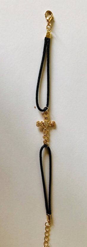 BRACELET MÉTAL DORÉ/SIMILI CUIR NOIR- CROIX DORÉE AVEC STRASS