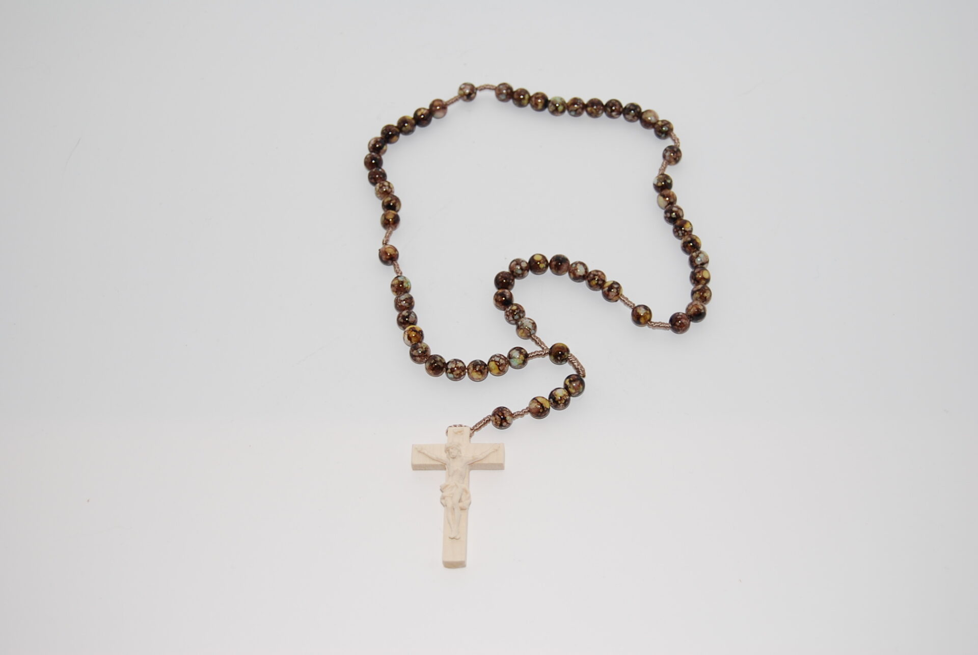 CHAPELET EN MARBRE MARRON/BEIGE SUR CORDE CROIX BOIS